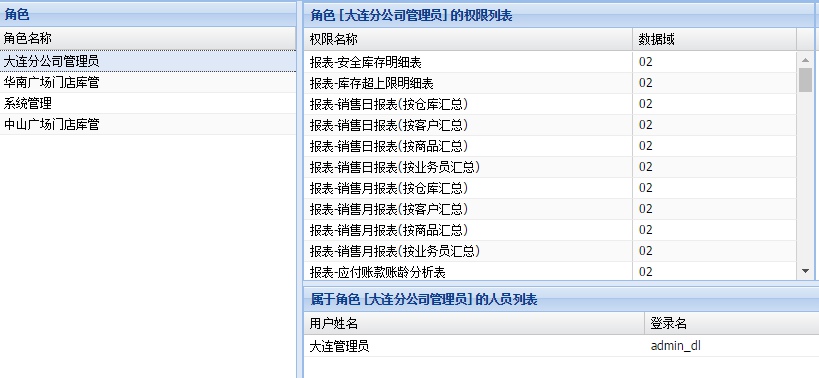 【南京分公司管理员】这个角色的权限中各个数据域都设置成了【02】,其中02代表的是南京分公司的数据域。